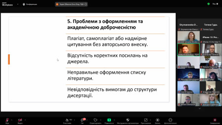 Другий вебінар, «Плагіат, цитування, запозичення: правила чесного письма», був зосереджений на академічному письмі як невід’ємній частині якісної вищої освіти. Розглядалися різні форми плагіату, правила цитування та перефразування, поняття автентичності тексту та принципи роботи антиплагіатних систем. Особливу увагу було приділено чесним способам підвищення унікальності академічних робіт, наголошуючи на важливості якісного змісту та етичного підходу до письма. Аспіранти, як майбутні науковці, отримали цінні знання про академічну доброчесність у наукових текстах.